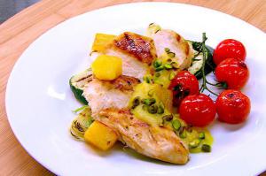 Приготовь курицу в духовке или на гриле. По желанию, можешь запечь и томаты.