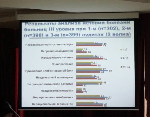 В результате было установлено, что качество помощи, оказываемой детям, соответствовало среднему баллу 1,8 при максимальной оценке 3. Среди лидирующих дефектов: нерациональное назначение антибиотиков и глюкокортикостероидов, причинение необоснованной боли, неправильное лечение, необоснованность госпитализации, полипрагмазия. Среди менее распространенных – неадекватные инфузии и неправильный диагноз. По завершению аудита в конце года этот показатель улучшился и составил 2,4.