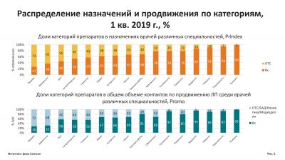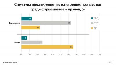Отчасти это объясняется высокой долей безрецептурных препаратов в структуре общего продвижения ЛП – на них приходится почти 27% от общего количества контактов в рамках маркетинговых активностей, направленных на врачей, по данным исследований PrIndex «Мониторинг назначений лекарственных препаратов» и Promo «Мониторинг промоционной активности фармацевтических компаний» компании Ipsos Comcon.