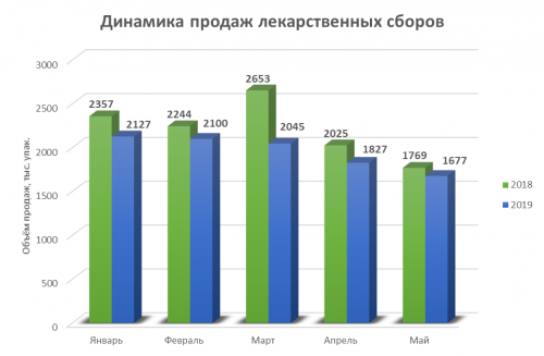Максимальное падение продаж лекарственных сборов пришлось на март, когда объем их реализации сократился на 9,8% в рублевом и на 22,9% в натуральном эквиваленте.