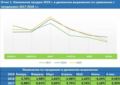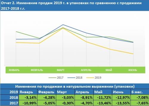 За I полугодие 2019 г. объем продаж в аптеках вырос на 0,56% по сравнению с аналогичным периодом 2018 г. и на 2,25% по сравнению с  2017 г. При этом наблюдается  значительное снижение в сравнении с 2018 и 2017 гг. объемов продаж в упаковках – на 7,08% и 7,65% соответственно.