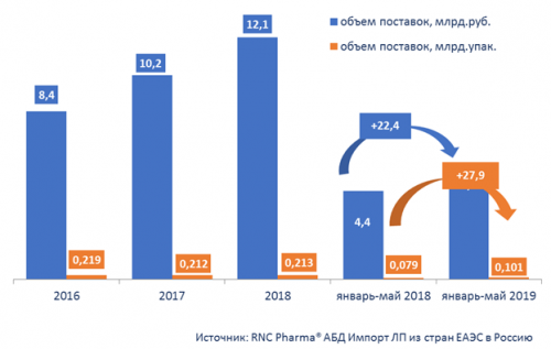 За период с января по май 2019 г. в Россию было ввезено лекарственных препаратов, произведенных на территории стран ЕАЭС, на сумму 5,4 млрд руб. (в оптовых ценах, включая НДС), сообщает аналитическая компания RNC Pharma.