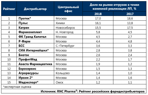 Аналитическая компания RNC Pharma представляет Рейтинг российских фармдистрибьюторов по итогам 2018 г.