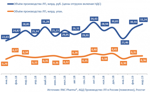 Динамика производства ЛП в России (включая производство ЛП иностранных фармкомпаний на собственных и контрактных площадках) за январь 2018 – март 2019 гг., в натуральном (упаковки) и денежном выражении (руб., включая НДС)