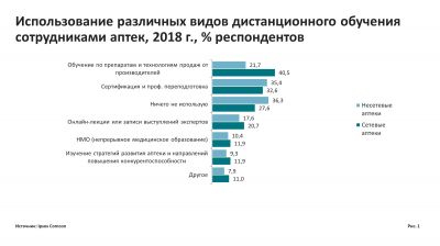В дистанционное обучение по препаратам и технологиям продаж, организуемое компаниями-производителями, вовлечены более 40,5% сотрудников сетевых аптек, тогда как для сотрудников несетевой части розничного звена этот показатель составляет не более 21,7% (рис. 1).