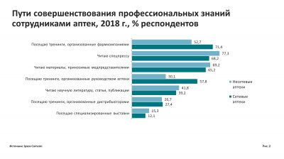 По данным осенней волны 2018 г. исследования Рharma-Q «Мнение провизоров-фармацевтов» компании Ipsos Comcon, доля сотрудников, прослушивающих онлайн-курсы или записи выступлений экспертов, также выше в сетевых аптеках – 20,7% против 17,6% в несетевых.